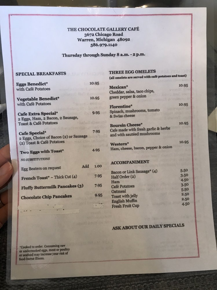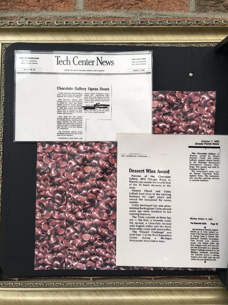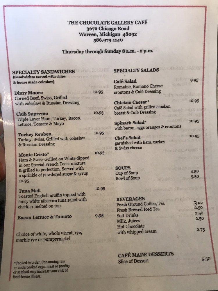The Chocolate Gallery Cafe in Warren, MI offers a delightful mix of New American cuisine with a focus on delectable desserts, breakfast, and brunch options. Known for its cozy ambiance and friendly service, this cafe is a popular choice for families and groups. The menu features unique and inventive dishes, with a special mention of the exceptional specials posted on the wall. Customers rave about the delicious food, with standout items like Peggy's specials and the diverse breakfast offerings receiving high praise. While some mention slight issues like undercooked potatoes and slow service, overall, The Chocolate Gallery Cafe stands out for its consistently fabulous food and warm atmosphere. If you're looking for a charming spot to enjoy a memorable meal with loved ones, this cafe is a must-visit.